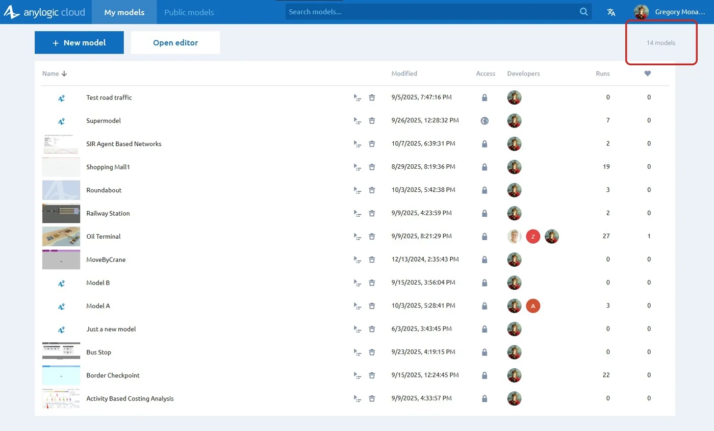 Since we opened AnyLogic 9 Technology Preview for everyone, the My models view has become the central hub and starting point for Cloud users. From the view you may perform various actions: edit the model, open the experiments, etc. The view is designed in the same way as the Public models view, which is not convenient for managing your own models.
