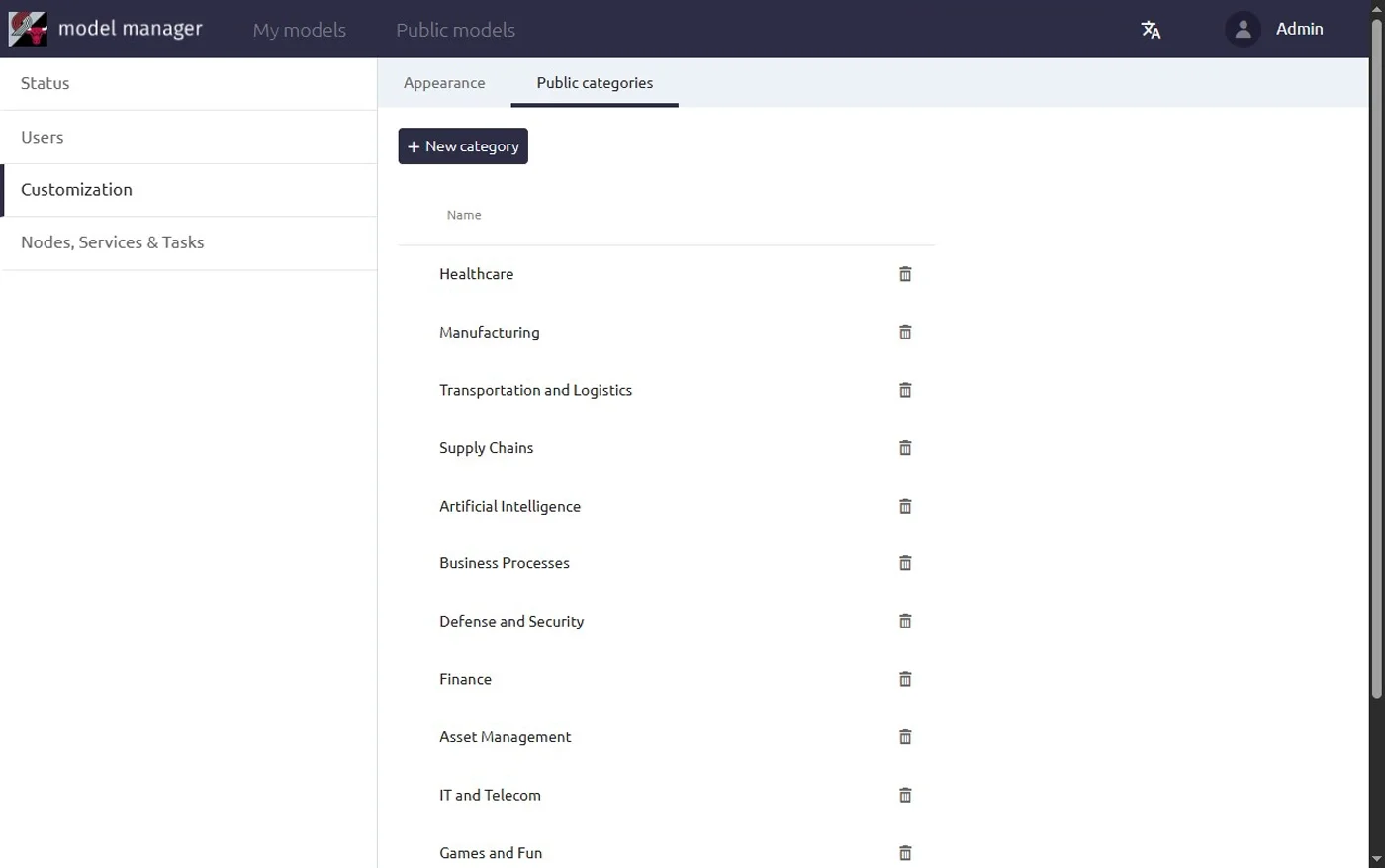 Private Cloud administrators know the product is shipped with built-in categories for public models, similar to cloud.anylogic.com. Prior to version 2.5.4, administrators could change the logo, title, and color scheme, but not the categories.