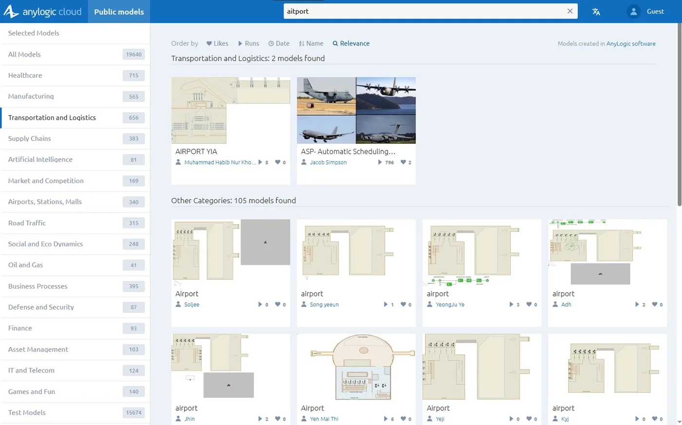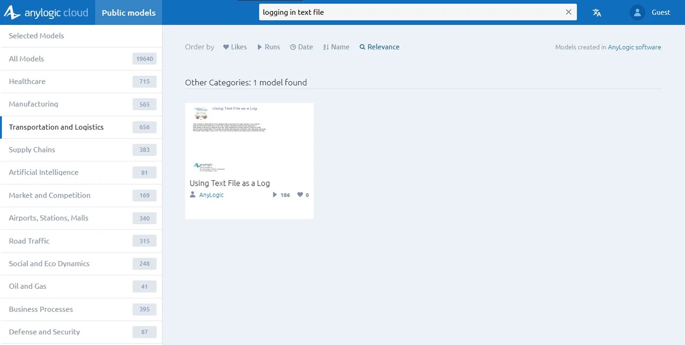 When you search within a specific model category, AnyLogic Cloud now also shows relevant models from other categories, listed just after the main results. This means you’ll still find what you need—even if you chose the wrong category or a model wasn’t categorized correctly. - See the results at a glance. Each search now displays the total number of models found, giving you instant feedback on how broad or narrow your search results are.