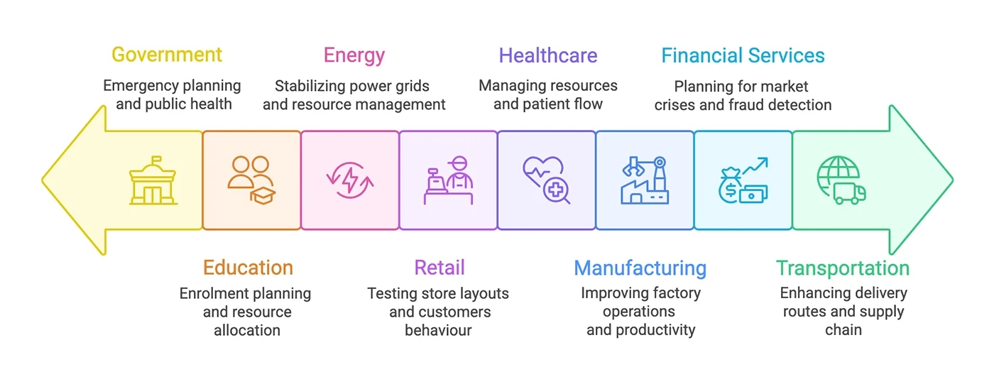 Even sectors like energy, government, and education are using simulation. Energy companies model power grids to keep them stable. Governments use it to plan for emergencies like floods, public processes, or social crises. School systems simulate enrollment changes to improve how they use buildings and staff.