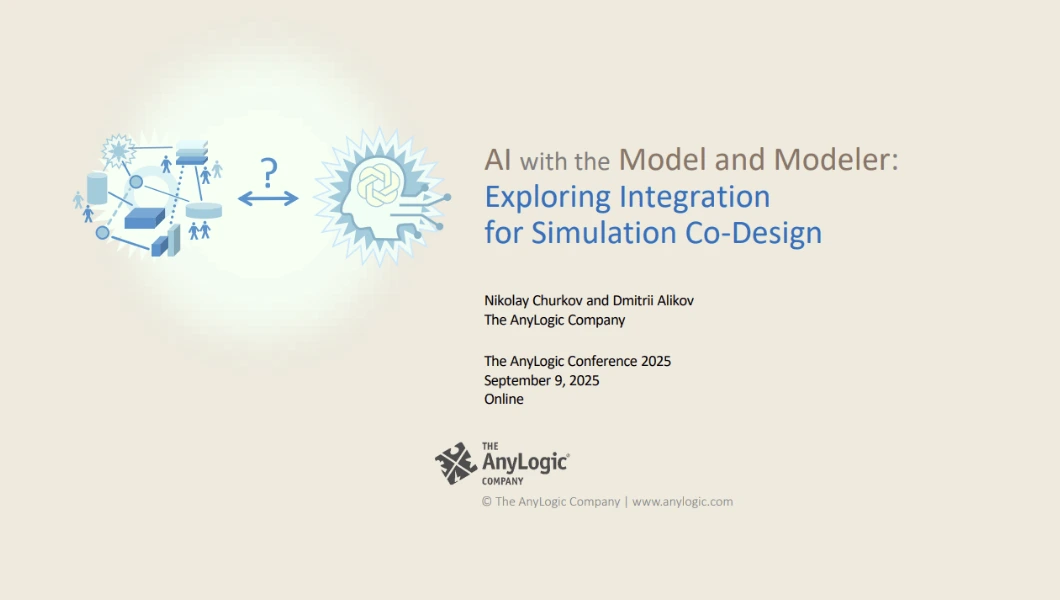 The AnyLogic team showcased their R&D on integrating large language models (LLMs) with simulation. They demonstrated how GPT-5 can generate working models using an extended Python API.