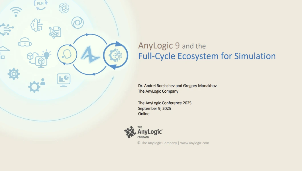 Andrei Borshchev and Gregory Monakhov presented AnyLogic 9, the next step toward a unified and collaborative simulation environment. In the demo, they showcased the AnyLogic 9 workspace, already available libraries (Fluid, Traffic, Rail), a built-in database for dynamic data inputs, and powerful search and refactoring tools.