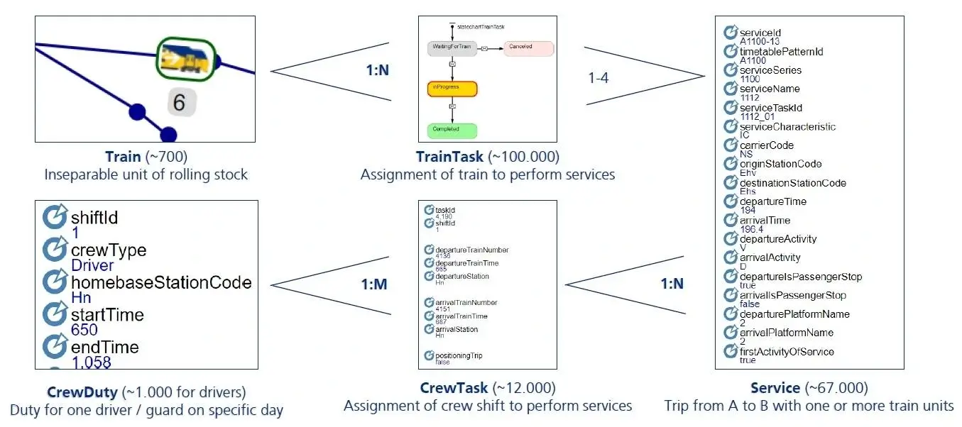 Netherlands Railways implemented a purpose-built simulation model using AnyLogic to address these challenges. The model integrated train timetables, infrastructure, rolling stock plans, and crew schedules into a cohesive simulation environment.