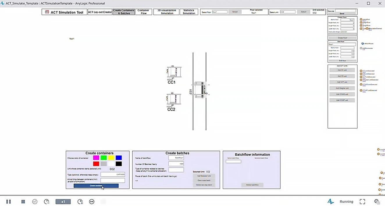 To address these challenges, KSE adopted AnyLogic. Using an agent-based simulation modeling approach, they created a simulation model in which each Automated Container Transfer (ACT) system’s unit type, such as elevators, conveyors, and dosing units, was represented as an agent.